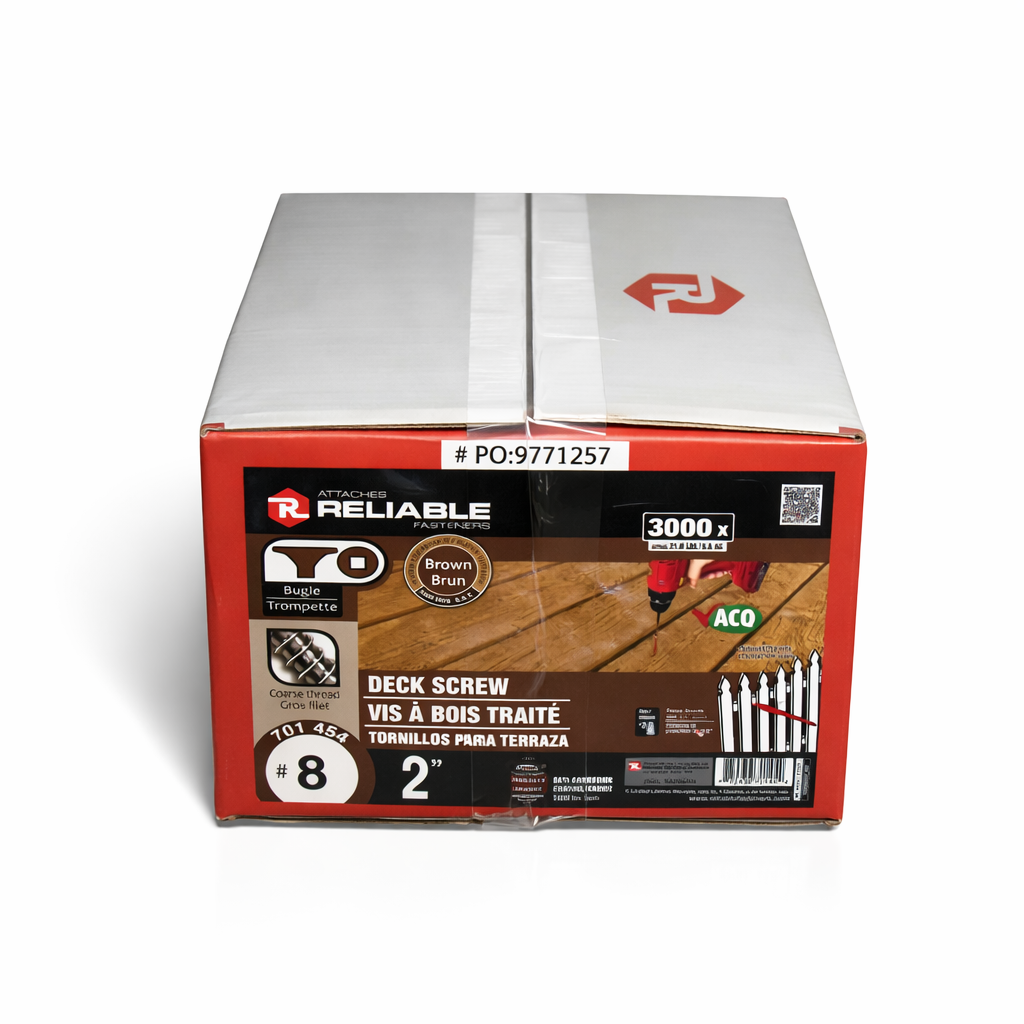 La vis à bois traité brun no 8 de 2″ est idéale pour les assemblages légers à moyens dans le bois traité et autres bois extérieurs. Sa longueur de 2″ permet une fixation solide dans les planches de taille modérée tout en assurant un travail précis et propre. Elle convient aux projets résidentiels ou commerciaux tels que terrasses, cadres, clôtures ou petites structures portantes. Offerte en caisse de 3000 unités, elle est pratique pour les chantiers nécessitant un volume élevé de fixations et une productivité optimale.